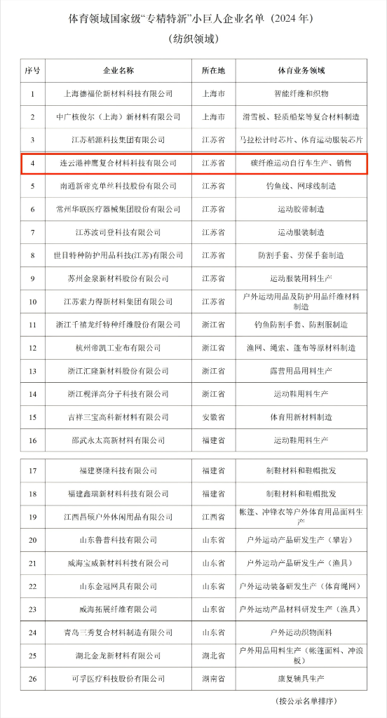 2025年4月3日,體育總局向社會公布體育領域國家級“專精特新”小巨人企業(yè)名單(2024年),鼓勵和引導體育企業(yè)向?qū)I(yè)化、精細化、特色化、新穎化方向發(fā)展,激發(fā)體育企業(yè)創(chuàng)新活力和發(fā)展動力。共有146家企業(yè)進入體育領域國家級“專精特新”小巨人企業(yè)名單,其中紡織行業(yè)相關企業(yè)共有26家,具體名單如下: